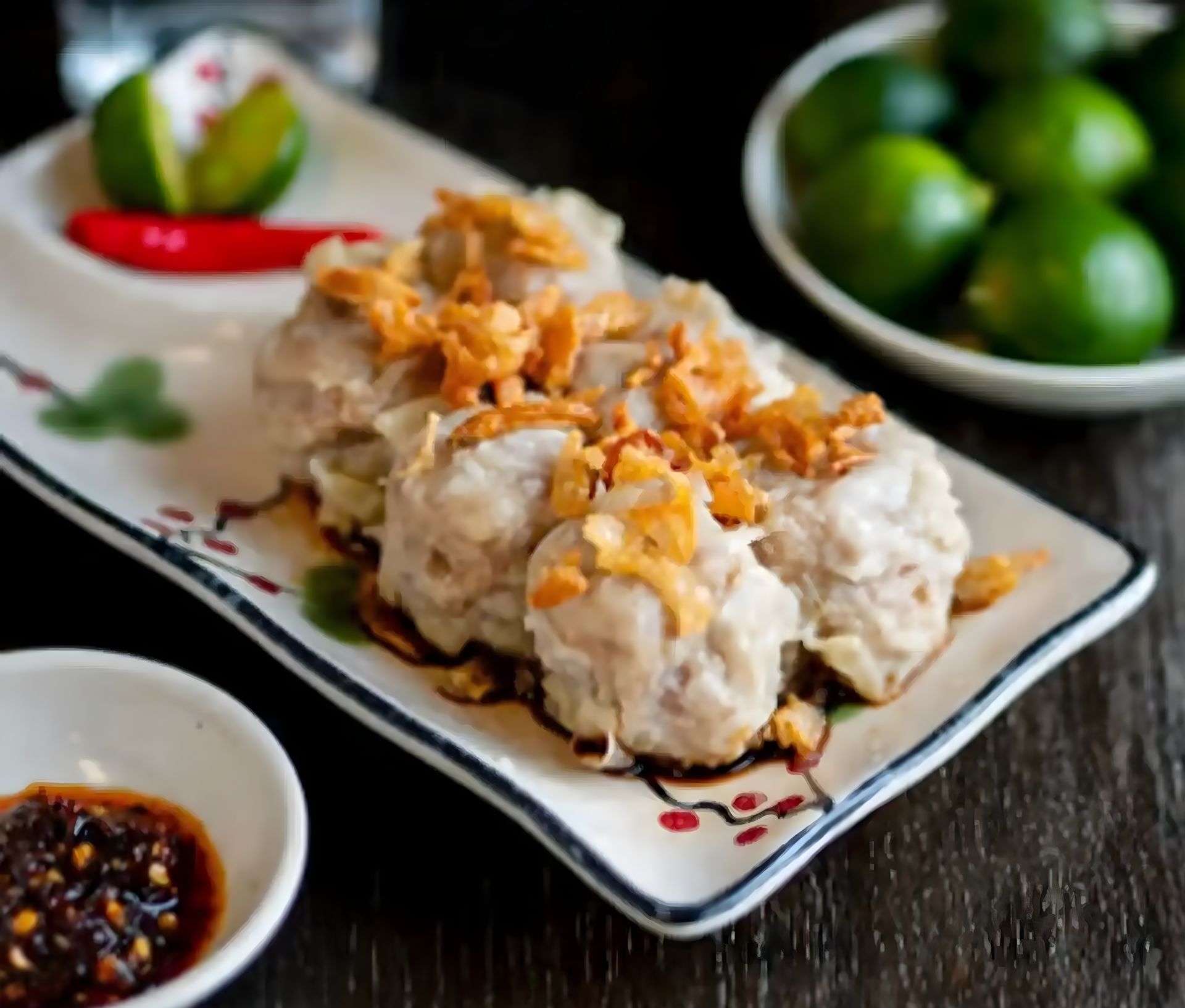 Steamed pork dumplings served with fresh calamansi and spicy chili oil