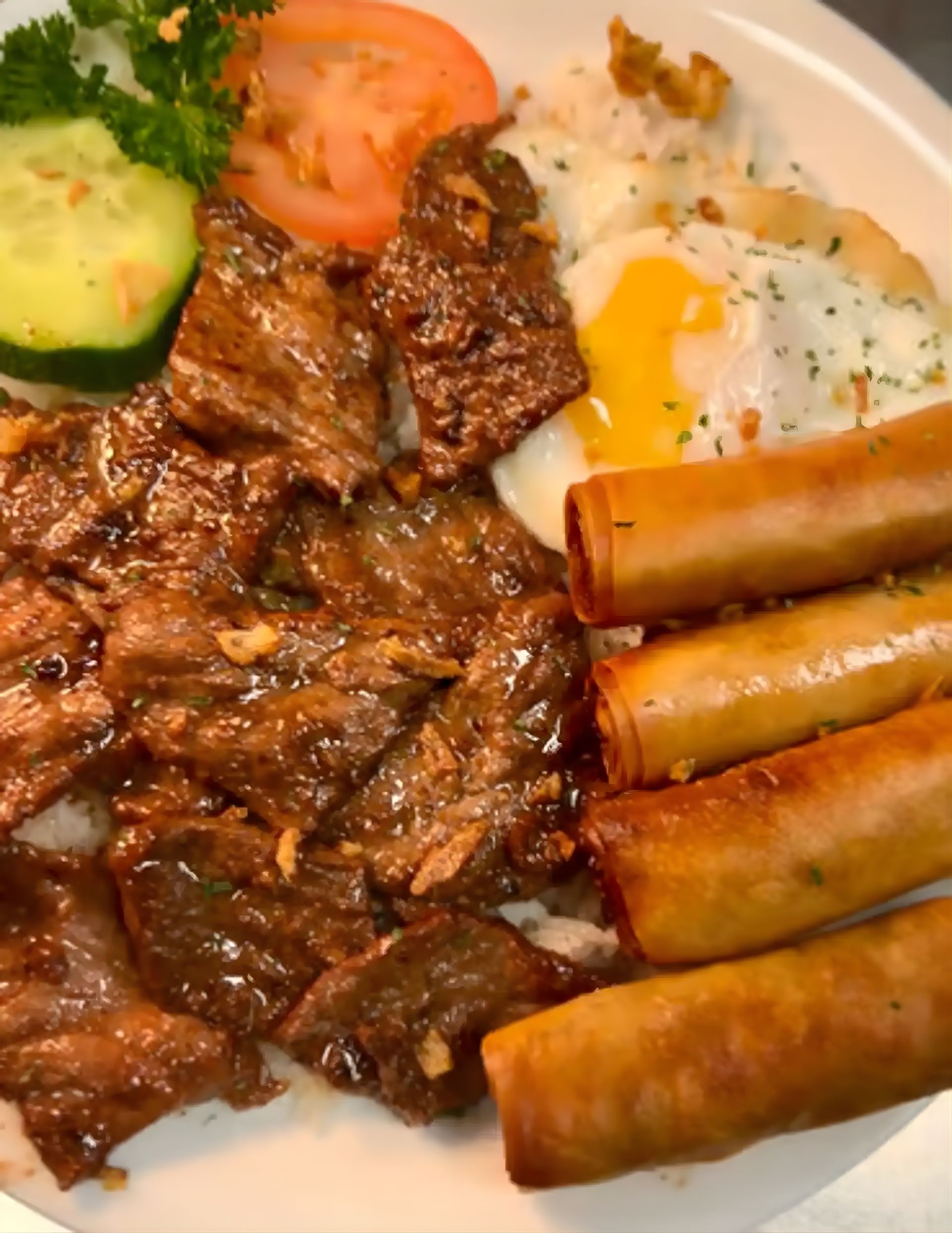 Delicious Filipino tapa with crispy spring rolls - a perfect combo